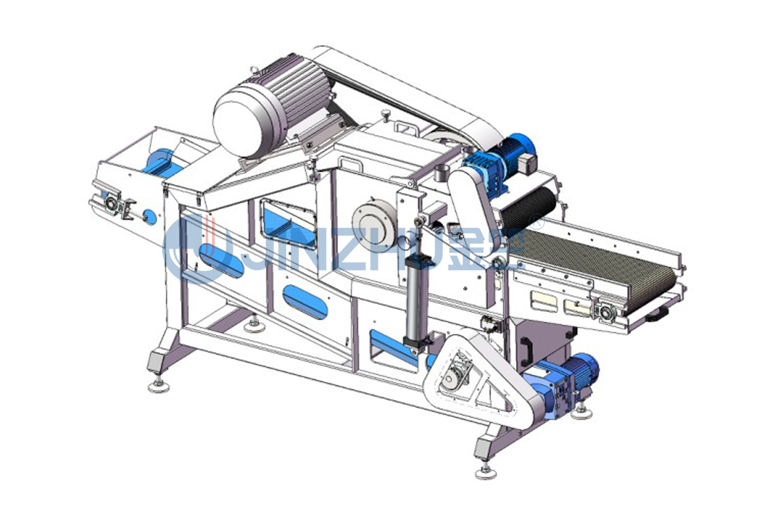 電機(jī)驅(qū)動(dòng)刀鼓轉(zhuǎn)動(dòng),隨輸送帶壓送進(jìn)料,切制藥材,藥材經(jīng)過(guò)篩網(wǎng)落入輸送帶出料,切制長(zhǎng)度由進(jìn)給速度和篩網(wǎng)孔徑?jīng)Q定。